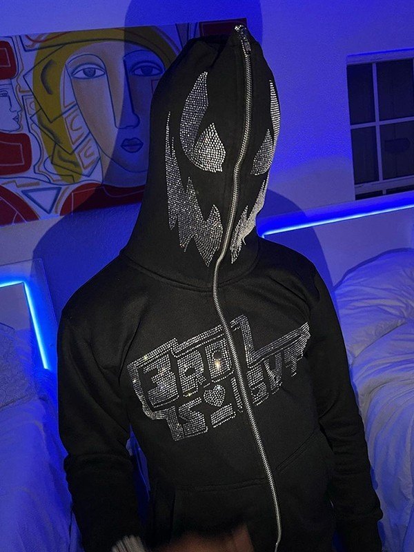 Sudadera con capucha y cremallera negra con diamantes de imitación para hombre