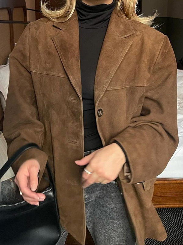 Abrigo holgado estilo western de lana de cordero con parches de color marrón retro