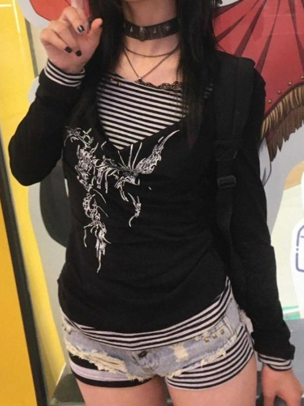 Camiseta de manga larga holgada con estampado de rayas de calle para hombre