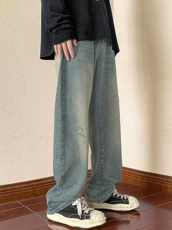 Jeans sueltos de mezclilla desgastada vintage para hombre