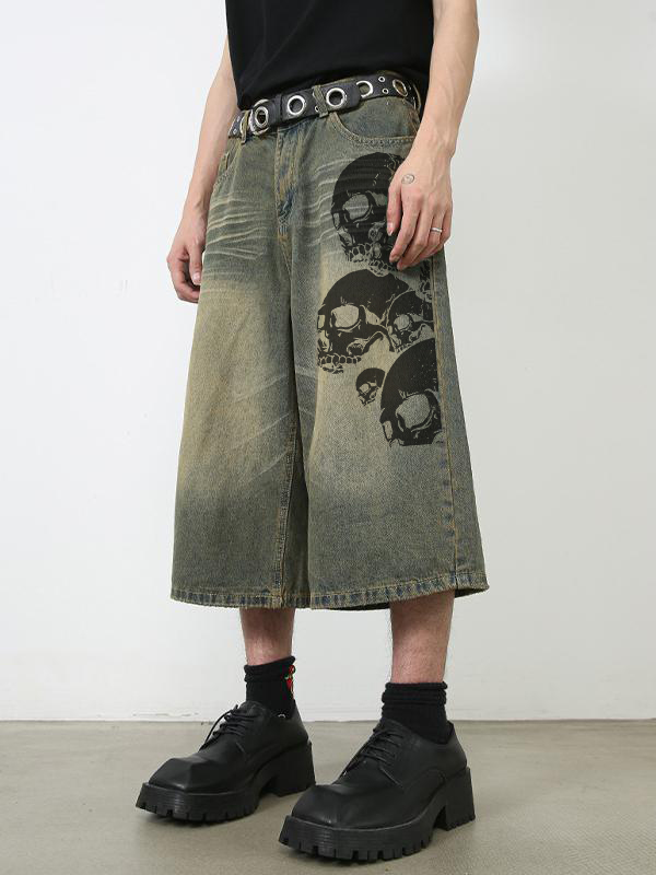 pantalones cortos de mezclilla casuales sueltos con estampado de calavera para hombre