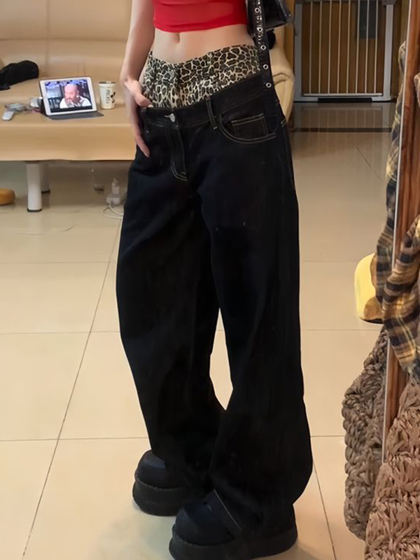 Vaqueros boyfriend con costuras y estampado de leopardo estilo retro americano