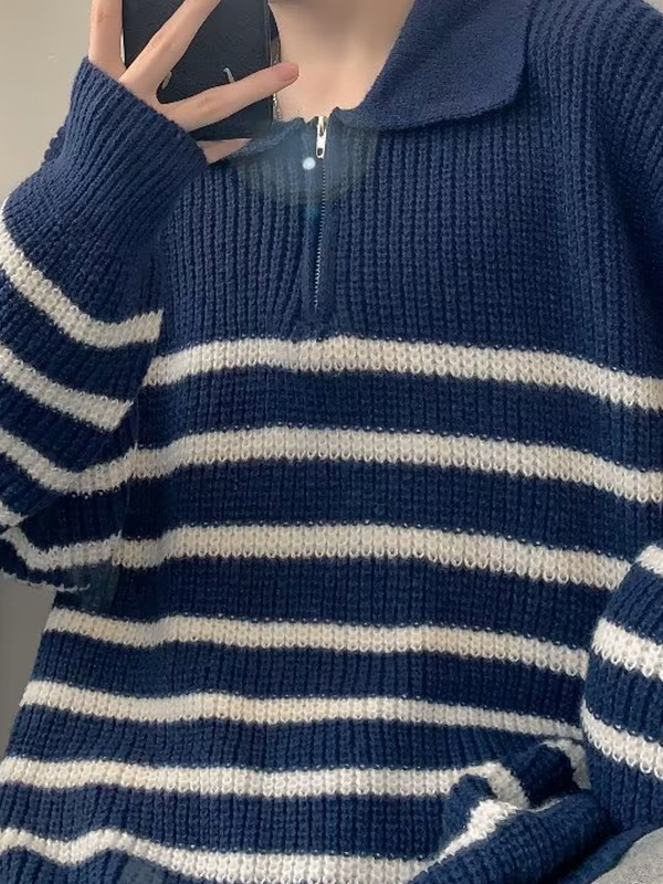 Suéter con media cremallera y cuello de solapa a rayas para hombre