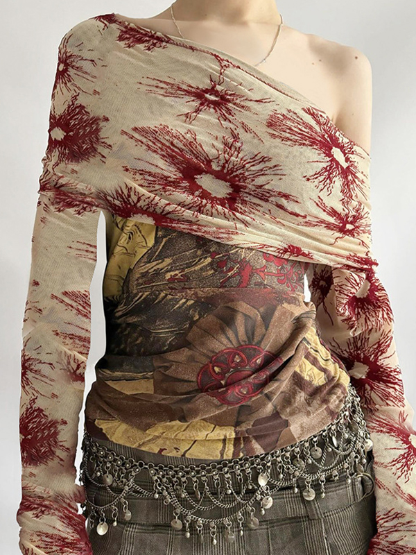 Camiseta de manga larga con un hombro al descubierto y empalme de malla