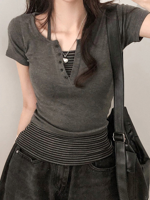 Conjunto de dos piezas de patchwork a rayas y manga corta