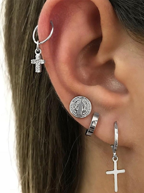 Juego de aretes de aro con cruz de plata de 4 piezas