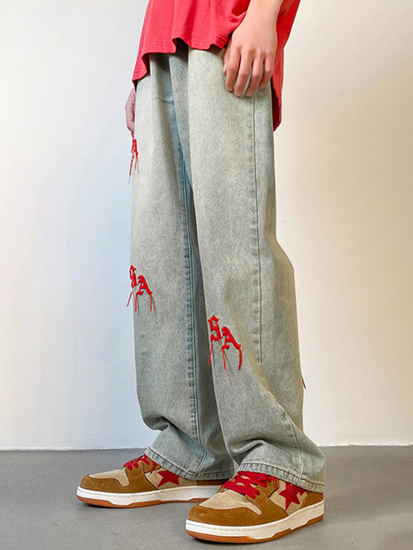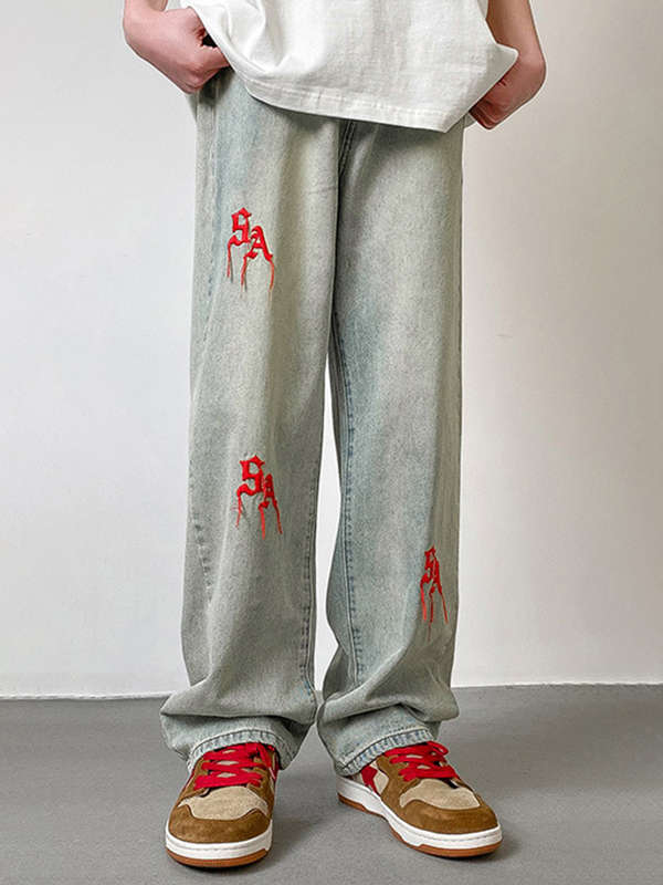 Descripción: Letra destacada bordada en la parte delantera y trasera, estos jeans tienen forma recta delgada Corte de pernera, bragueta con botón de cremallera y diseño de bolsillos funcionales.