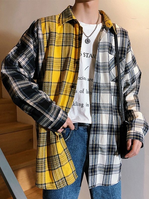 Camisa de manga larga a cuadros con bloques de color para hombre