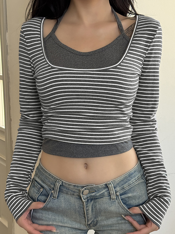 Camiseta informal de dos piezas con patchwork de rayas y manga larga