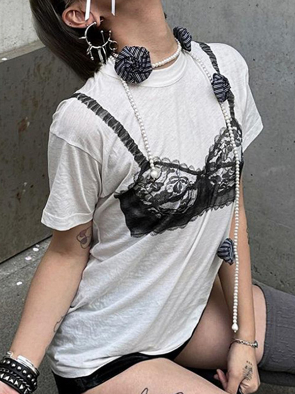 Camiseta de manga corta de gran tamaño con ropa interior de encaje