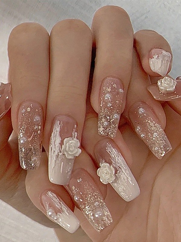 24 piezas de prensa floral de perlas de imitación en las uñas