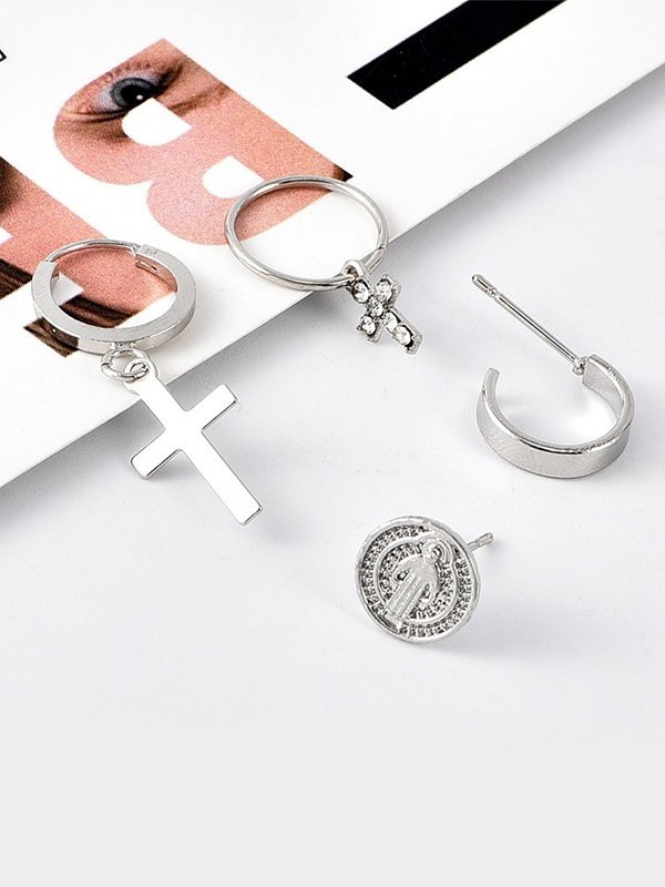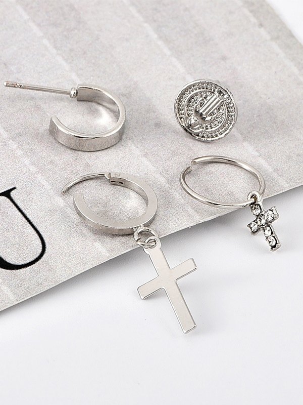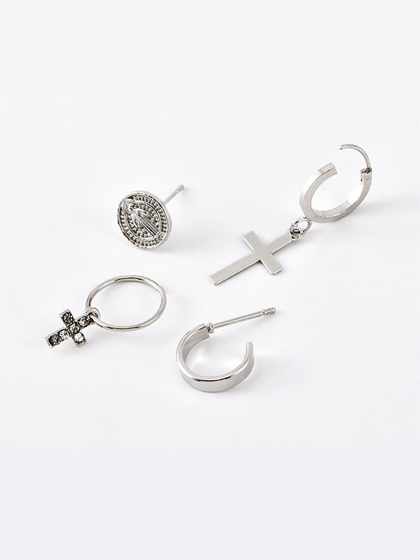 Juego de aretes de aro con cruz de plata de 4 piezas