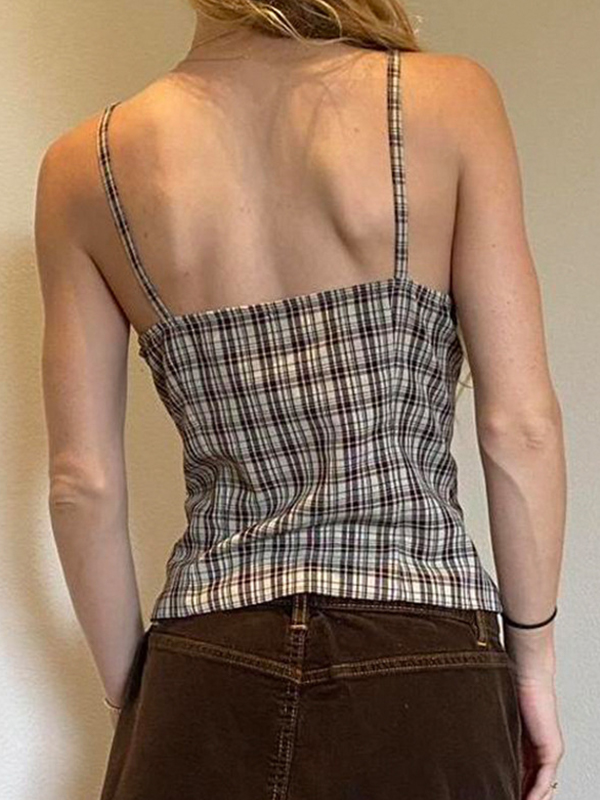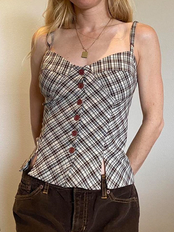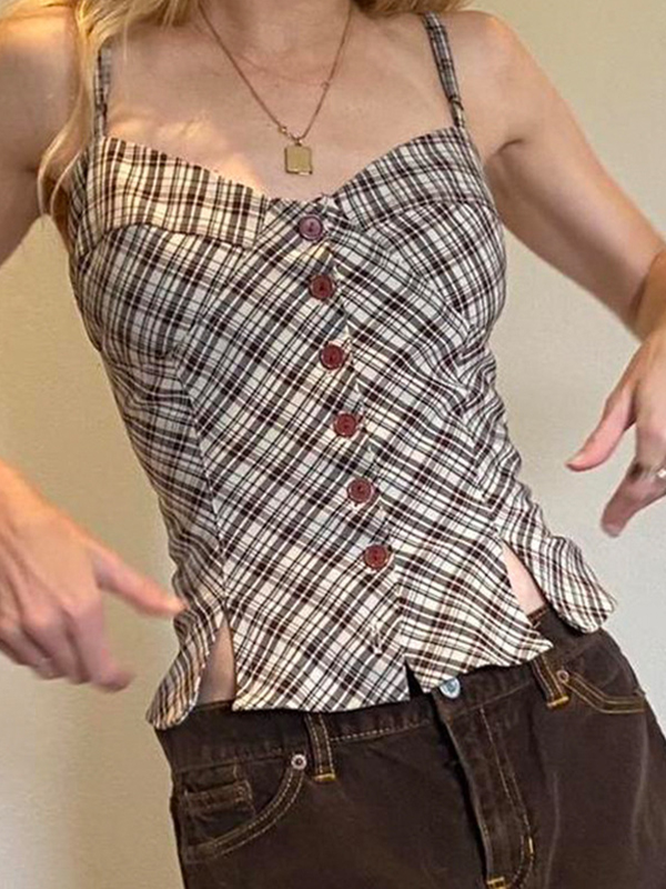 Top camisola con abertura y botones a cuadros estilo retro americano