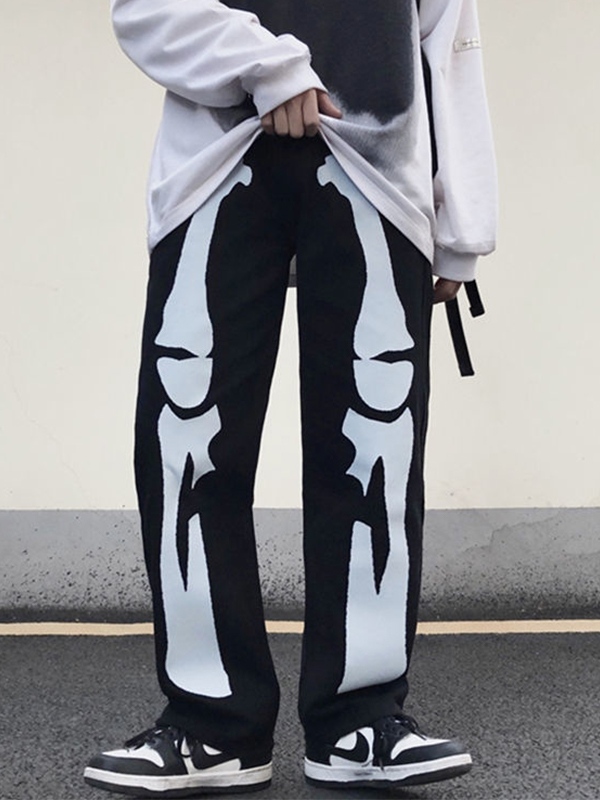 Vaqueros de pierna recta con estampado de esqueleto lavado en color en contraste para hombre